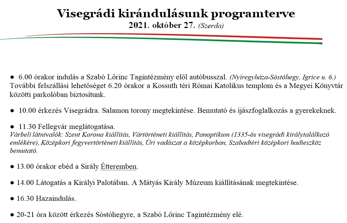 Október 27-én autóbuszos kiránduláson veszünk részt, melynek részletes programtervét alábbiakban ismertetjük: