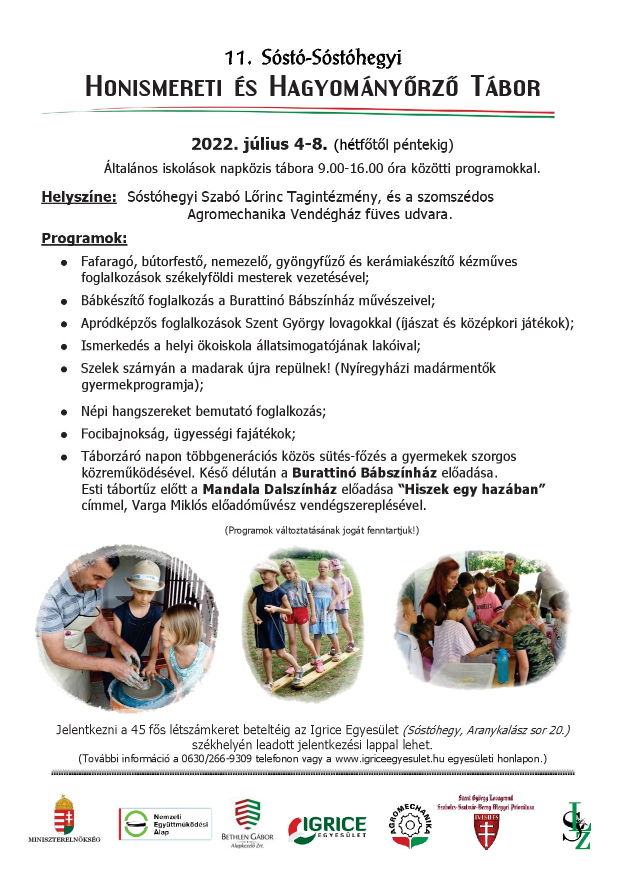 Évtizedes hagyományunkat őrizve, ebben az esztendőben is megtartjuk a Sóstó-Sóstóhegyi Honismereti és Hagyományőrző Táborunkat. Nagyon készülünk a gyermekek fogadására, és hasonlóan az eddigiekhez, most is tartalmas programokkal igyekszünk emlékezetessé tenni a nyári pihenőjüket.
