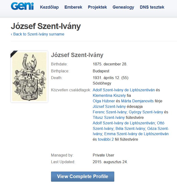 ⇒ GENI családfa-kutató portál bejegyzése Liptószentiváni Szent-Ivány József-ről