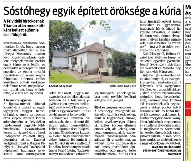 Liptószentiváni Szent-Ivány József a sóstóhegyi helytörténeti kutatásunk legizgalmasabb epizódját adó személyisége volt. Furcsa, de az életútjának leírásáról, így benne a Sóstóhegyhez való kötődéséről az 1931-ben bekövetkezett halála kapcsán a Nyírvidék újságban megjelent nekrológ ad nagyszerű összefoglalót.