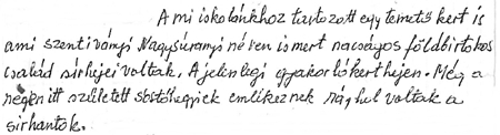A családi sírkert helyének azonosításához a legfontosabb információt Manyi néni 2002-ben kézzel írott visszaemlékezésében találtuk: