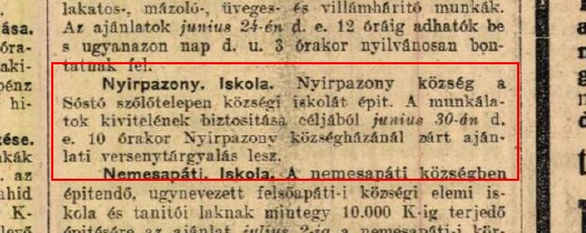 Abban az időben Sóstóhegy, akkori nevén Sóstó-Szőlőhegy közigazgatásilag Nyírpazonyhoz tartozott. A két hirdetés tartalma alapján joggal adódik az a következtetésünk, hogy az iskola 1912. januárjában kezdhette el a tényleges működését.