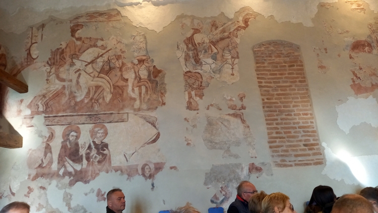 Oklándi Unitárius templom, falán a Szent László legenda freskótöredékei a XIII. századból.