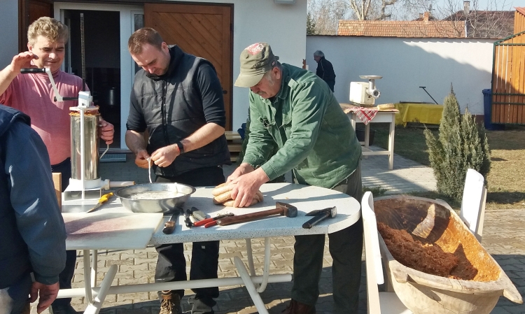 Idei hagyományos disznótoros napunk időpontjának kiválasztásánál nagy segítséget kaptunk az „időjárás felelőstől”, mert igazi napsütéses tavaszváró napon kísérhettük utolsó útjára a közel kétszáz kilós „malackánkat” a hurka-kolbász, disznósajt és tepertő készítésen át egészen az ünnepi vacsoraestünk végeztéig. (Igaz, tovább is, mert a másnapi takarítási "utóvédharcokról" sem kell ilyenkor elfelejtkeznünk!)