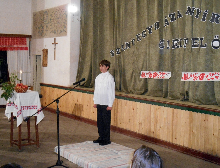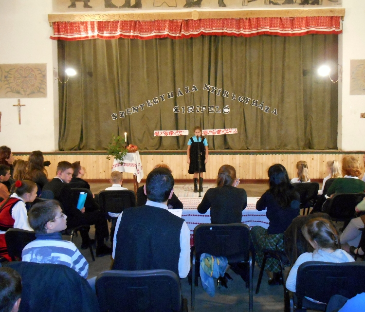 Október elején öt nyíregyházi általános iskolából 30 gyerek mérhette össze tudását sóstóhegyi válogató versenyünkön. Közülük kerültek kiválasztásra azok a gyerekek, akik erdélyi autóbuszos kirándulásunkra vendégként jöhettek el, és Szentegyházán mese és versmondó, valamint népdalt éneklő kategóriákban mérhették össze tudásukat a székelyföldi gyerekekével.