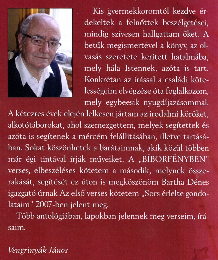 Vengrinyák Jánosnak (aki egyesületünk alapító tagja is egyben) ezúton gratulálunk a szép verseskötetért. Ezen könyve immár a második, mivel első verses könyvét „Sors érlelte gondolataim” címmel 2007-ben jelentette meg.