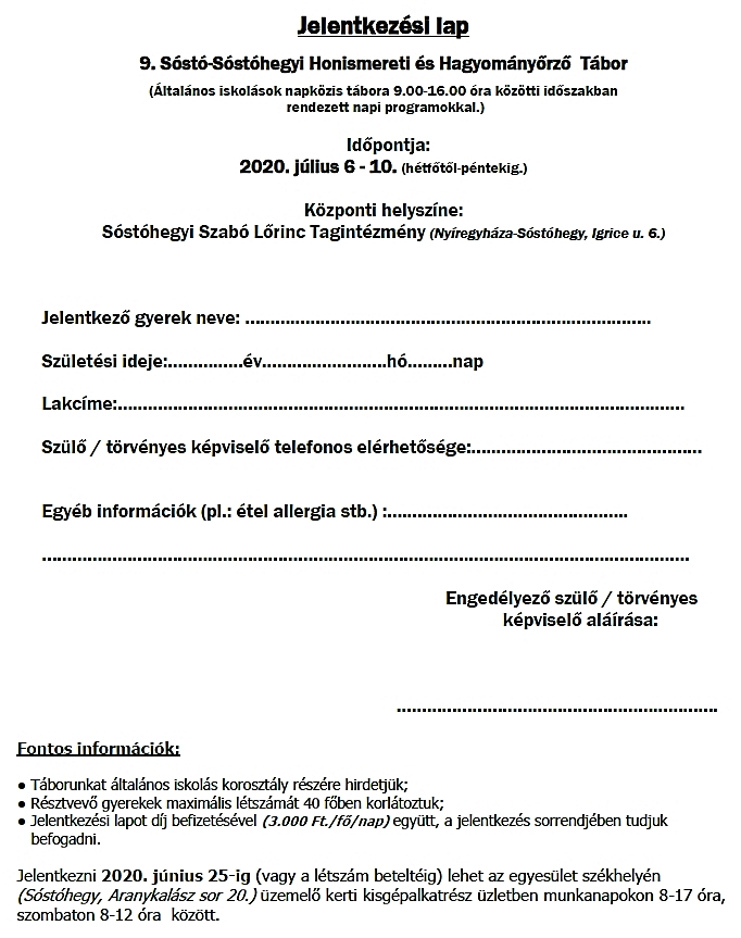 • Egészségi alkalmassági nyilatkozatot elegendő a tábor kezdésekor kitölteni. Fontos, hogy nyilatkozat hiányában a táborozásban nem lehet részt venni! (nyomtatványt a helyszínen biztosítunk)