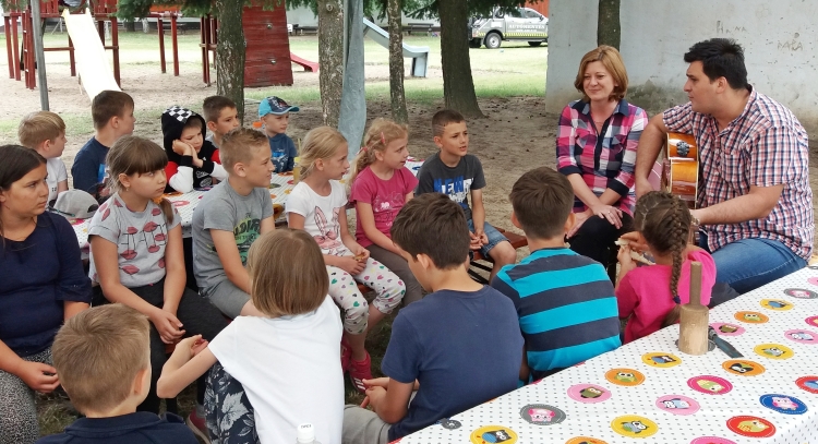 A csütörtök délutáni esős-csepergős időben gitáros előadóművész volt a vendégünk. Vele, és művésztársával együtt tanultuk és énekeltük a szép gyermekdalokat.
